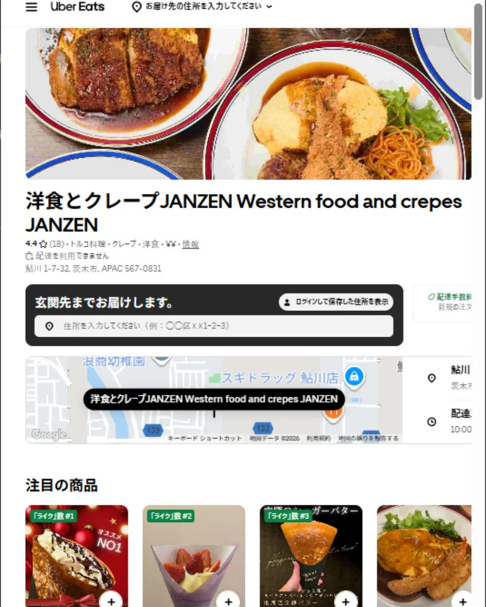 茨木市・鮎川にある「洋食とクレープのお店 JANZEN」は、ふわとろオムライスやデミグラスハンバーグなどの定番洋食と、もちもち生地にたっぷり具材を包んだクレープを楽しめるお店です。